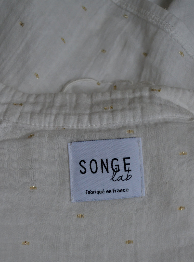 Jolie blouse Songe Lab blanche boutonnée en gaze de coton avec des volants sur le bas des manches et des petits reflets dorés.