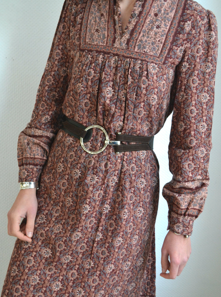 Très jolie ceinture de taille en cuir marron à la belle boucle circulaire en métal argenté.