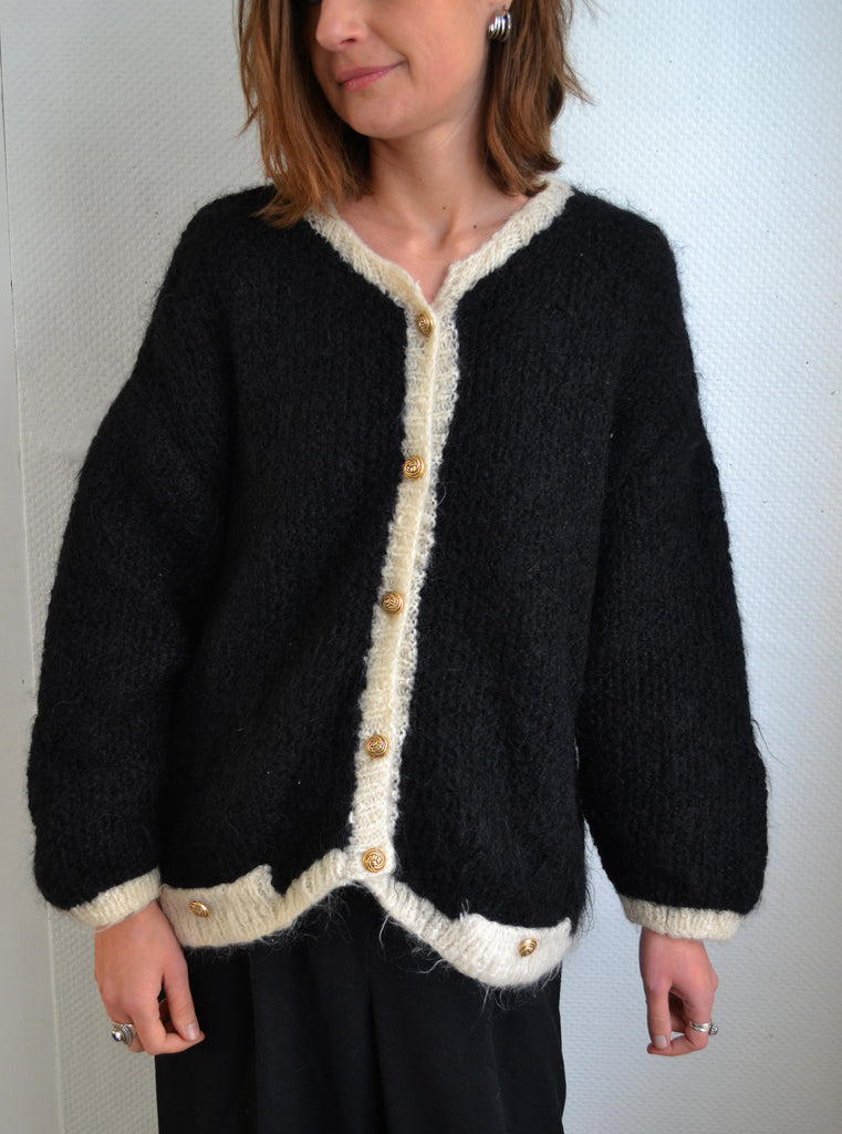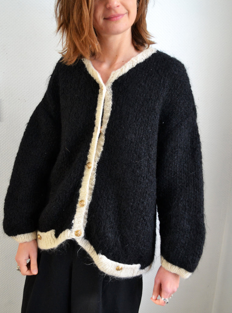Joli gilet en mailles épaisses fait main vintage noir et blanc avec des petits boutons dorés.