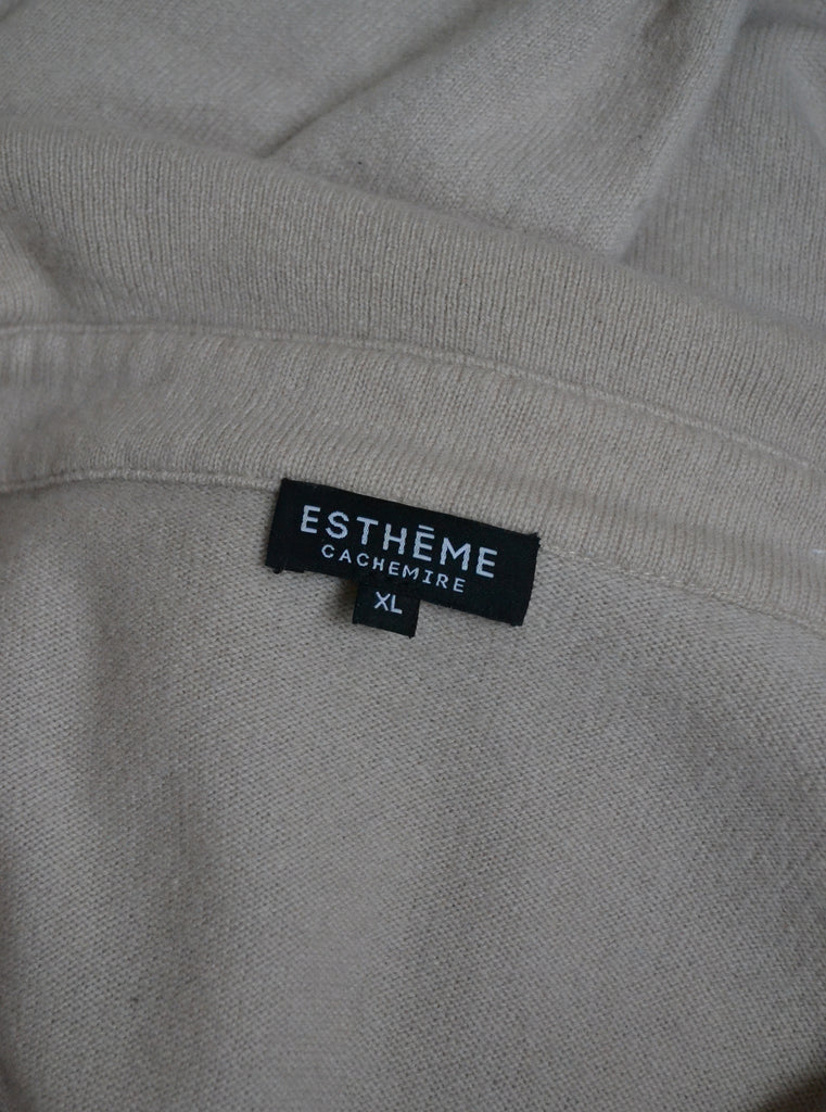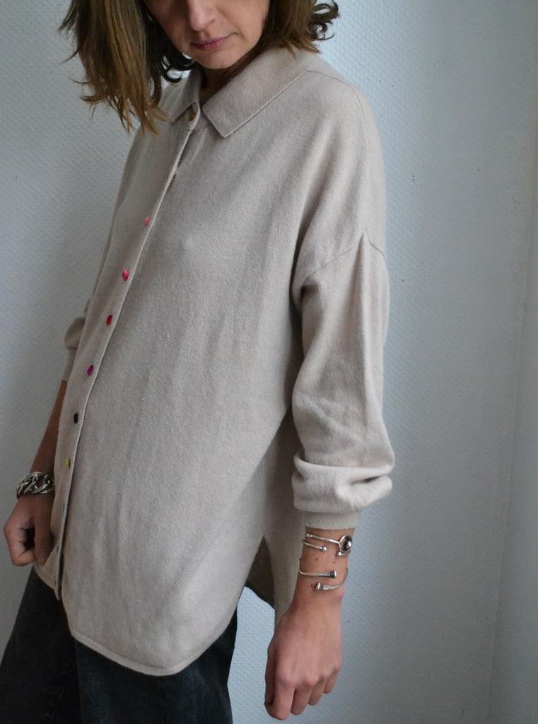 Joli gilet écru col chemise Esthème Cachemire avec des petits boutons colorés, coupe longue, fendu sur le côté.