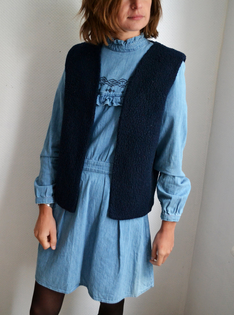 Le gilet en sherpa au coloris bleu marine facile à associer bien chaud et très qualitatif avec sa doublure en lin et ses finitions made in France !