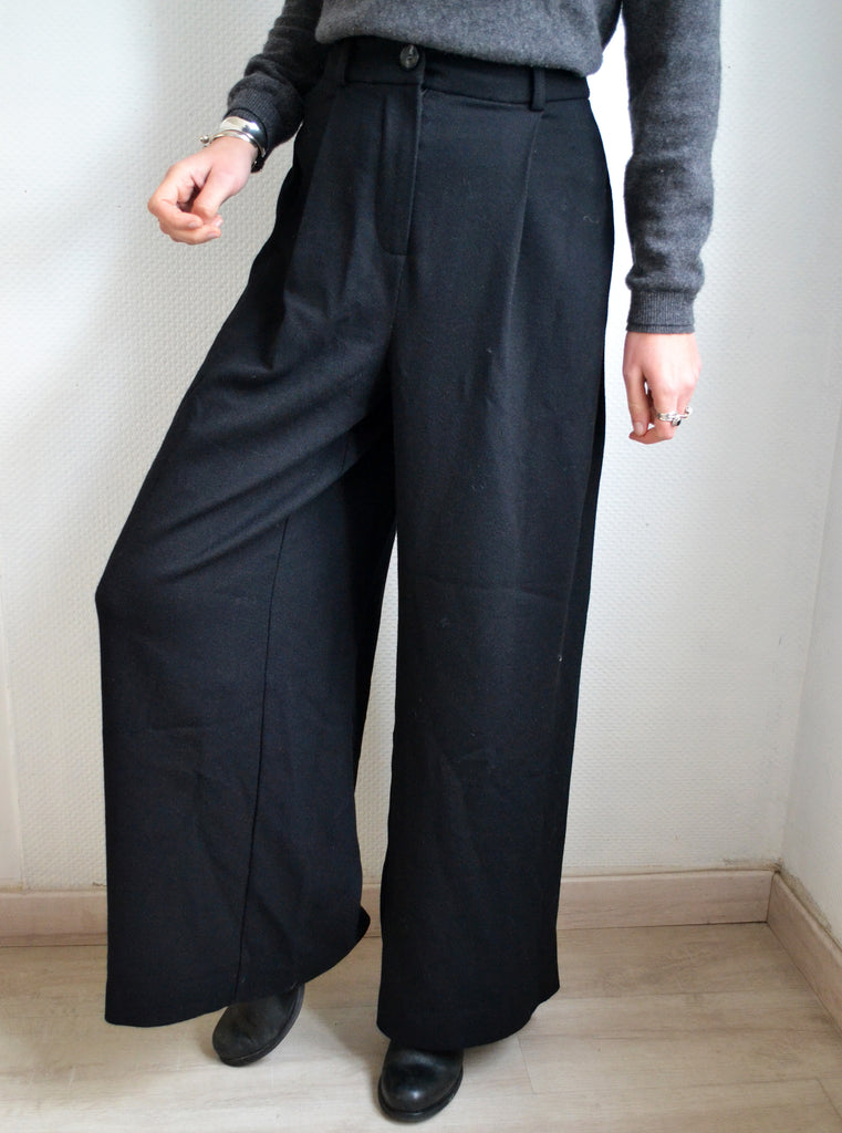 Joli pantalon fluide larges jambes type palazzo noir Essentiel Antwerp, taille haute avec une fermeture par un bouton, un zip, des poches et des passants.