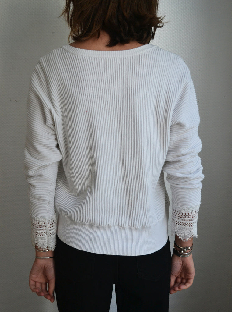 Joli pull blanc col V avec de la dentelle sur le col et le bout des manches.