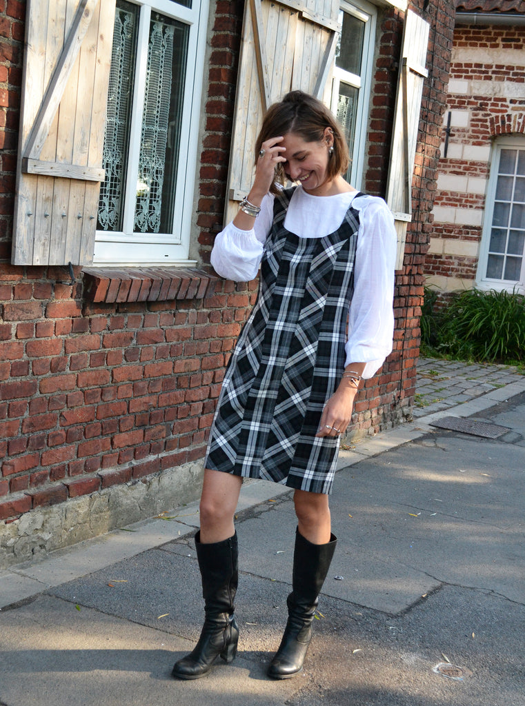 La robe vintage mais toujours actuelle à porter sur une chemise blanche avec une paire de bottes/boots pour un look intemporel de saison.