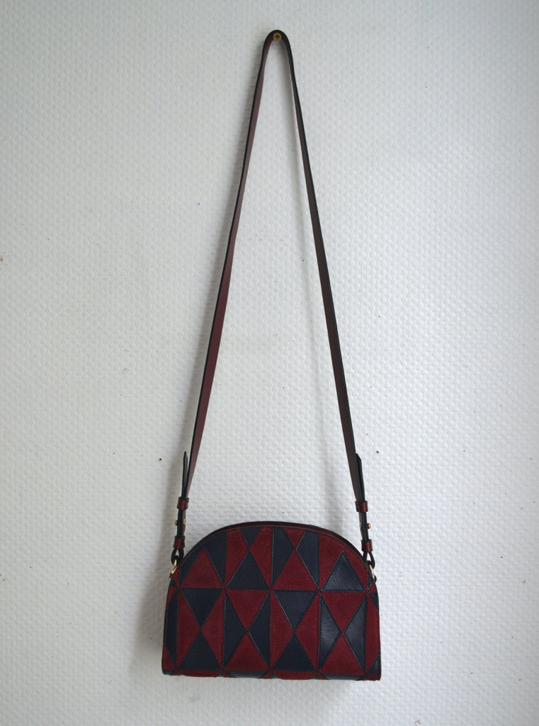 Un joli sac à la belle qualité à porter à l'épaule ou en bandoulière qui se distingue tout naturellement par ses jolis empiècements géométriques en daim et en cuir coloris bleu marine et bordeaux. Un élégant sac en cuir à porter sur un look chic ou plus casual !