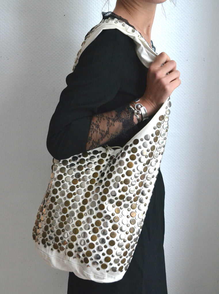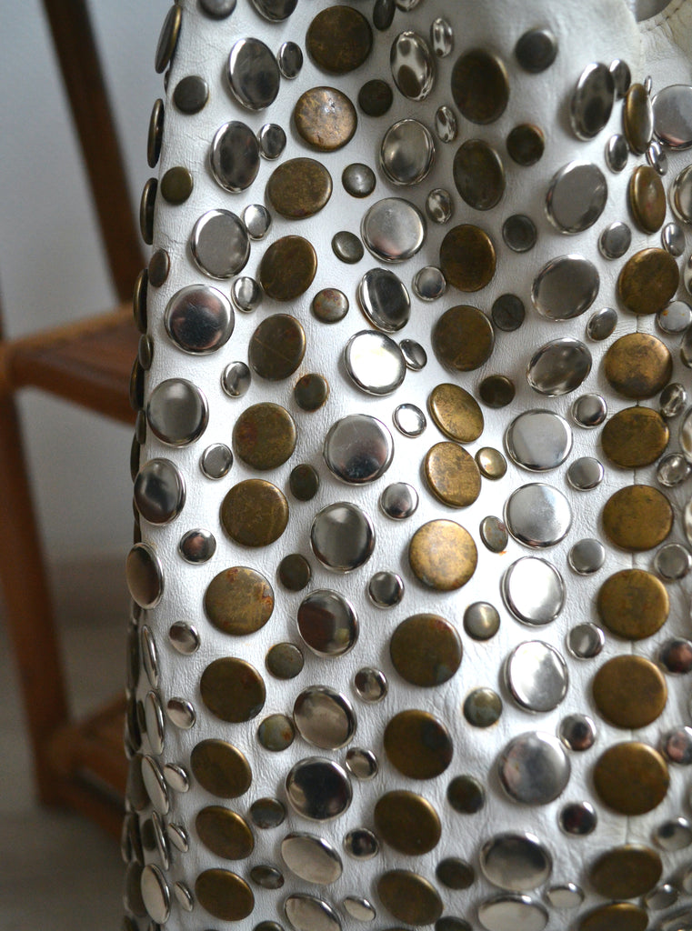 Superbe sac en cuir blanc orné d'une multitude de boutons argentés et bronze.
