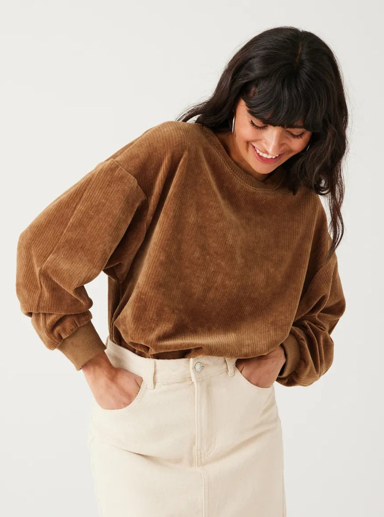 Joli sweat en velours côtelé camel manches bouffantes de chez Promod.