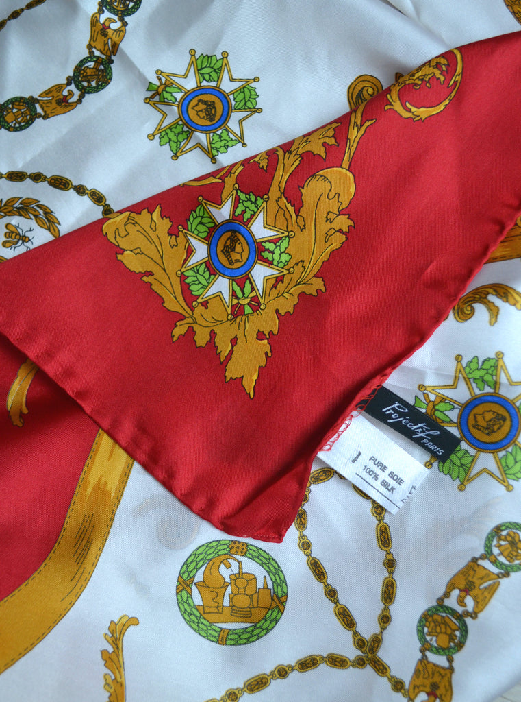 Un joli foulard de format carré en soie aux élégants motifs dorés sur fond blanc et rouge . Un foulard graphique à la belle qualité à porter autour du cou ou noué à la anse d'un sac pour un look chic.