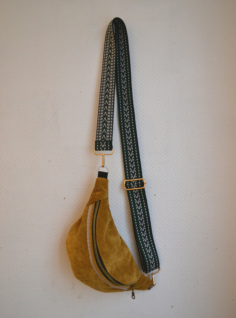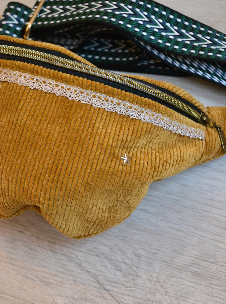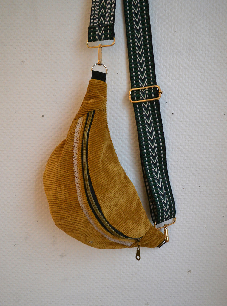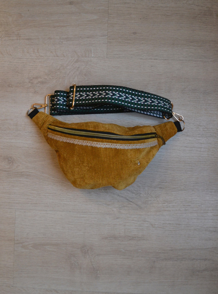 Très joli sac banane en velours côtelé coloris moutarde.