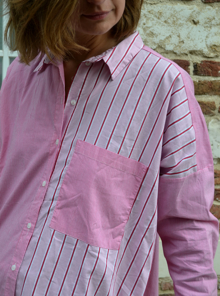 Jolie chemise à rayure rose et rouge Promod coupe assez loose avec une poche sur la poitrine.