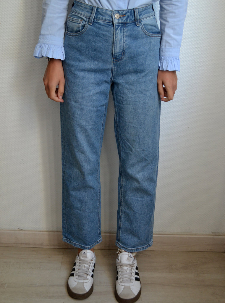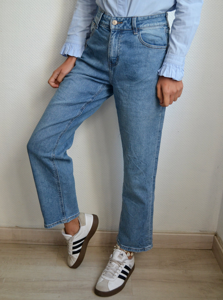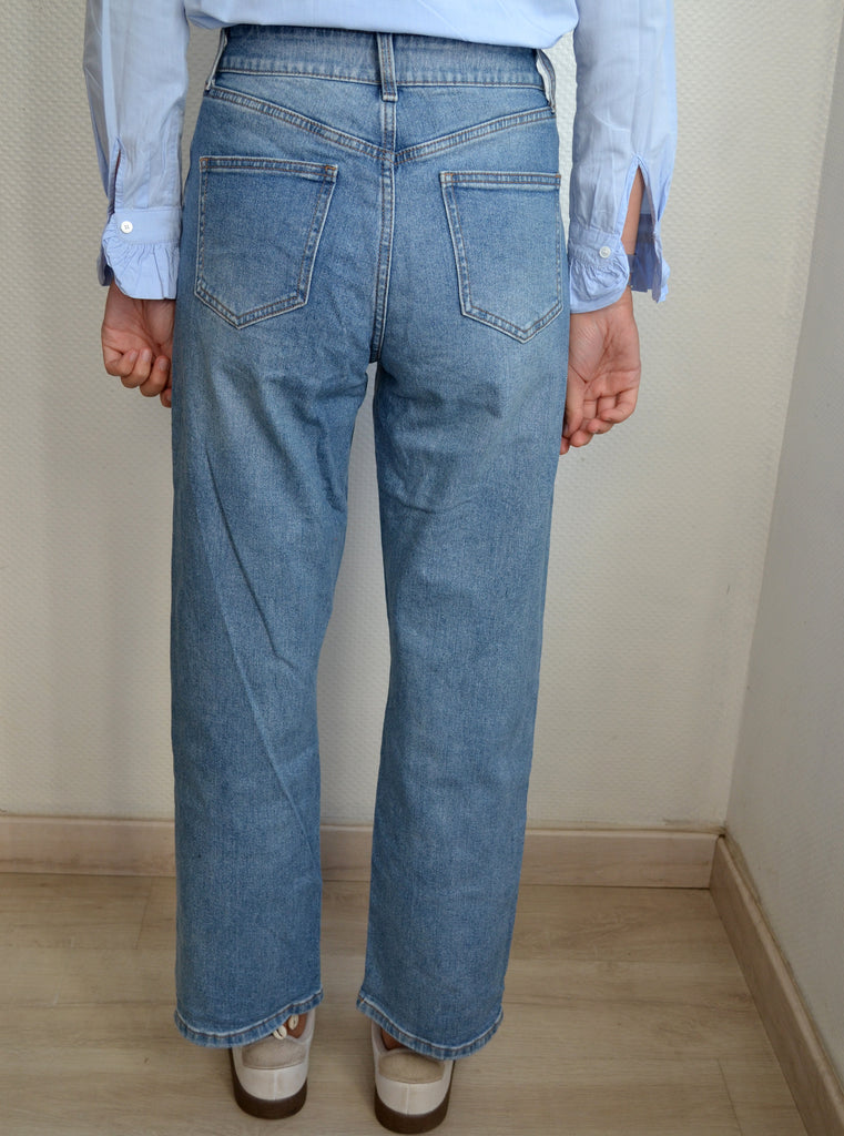Joli jean droit coloris bleu ciel Oraije avec une fermeture par un bouton et un zip.