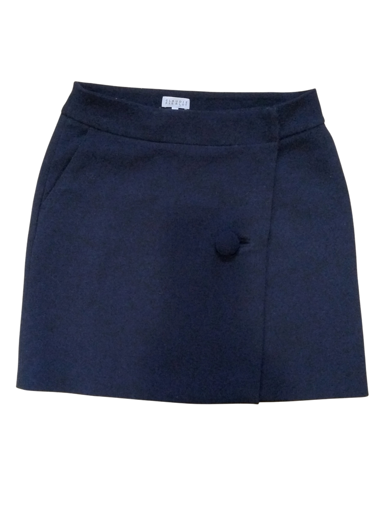 Jolie jupe portefeuille bleu marine Claudie Pierlot avec une fermeture par un bouton, une agrafe et un autre bouton ton sur ton au milieu de la jupe.