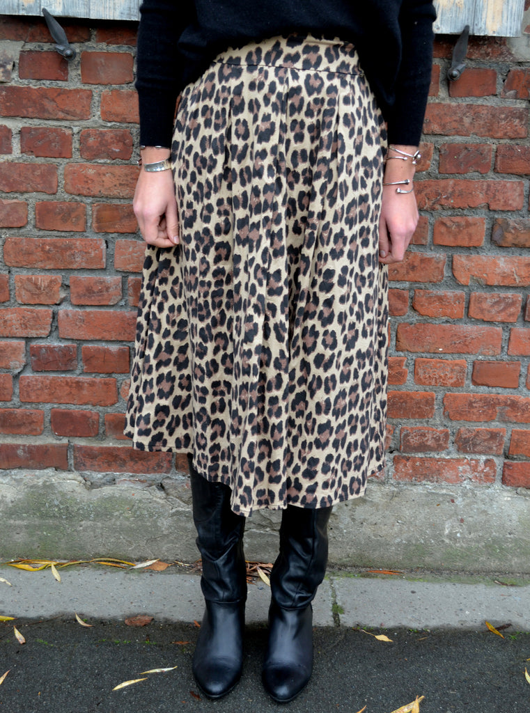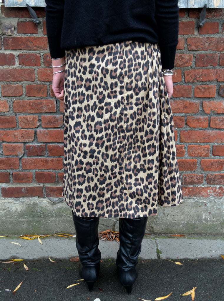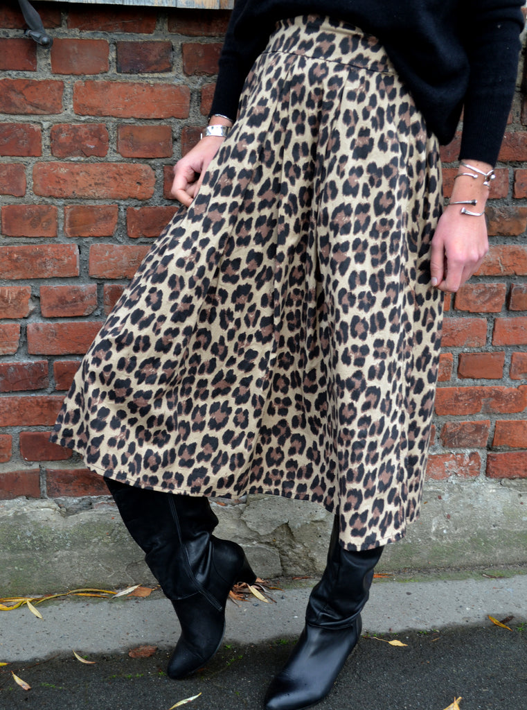 Jolie jupe midi motif léopard avec une taille élastique, des passants et des poches.