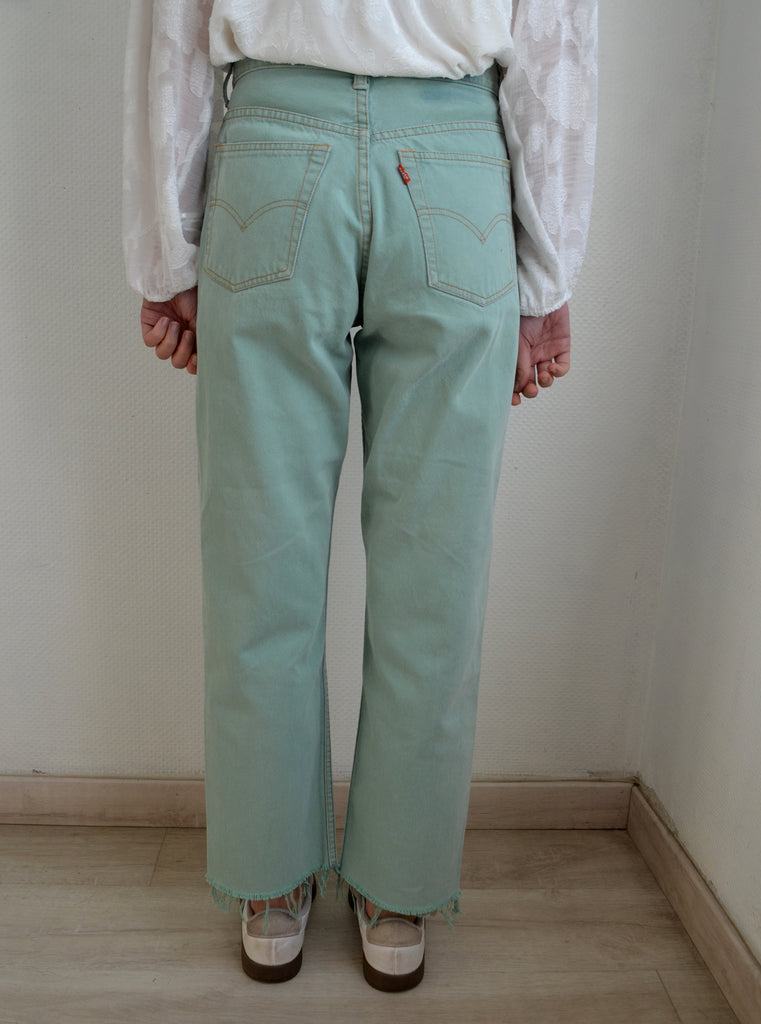 Joli jean Levis 501 vintage coloris vert d'eau made in USA, fermeture par boutons, effiloché sur le bas. ( à noter une toute petite tache sur l'arrière cf photo très peu visible)