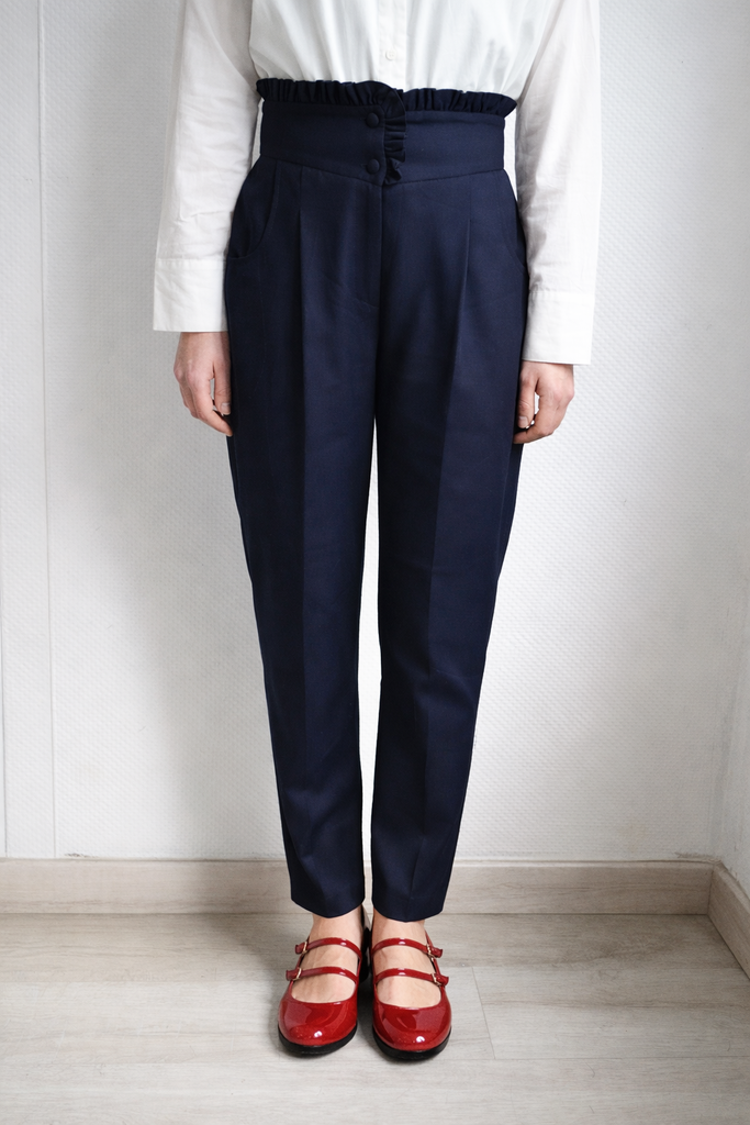 Joli pantalon droit bleu marine Rosaé Paris taille haute avec des fronces, boutonnée avec un zip et des poches.