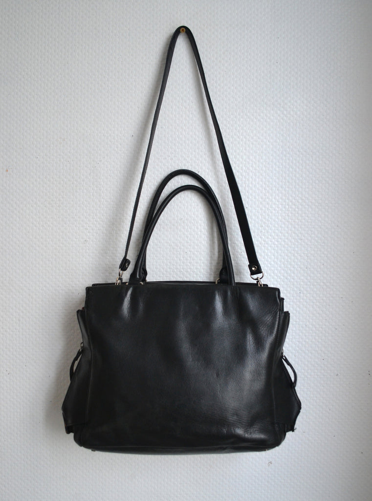 Une bandoulière fixe. Une paire de anses. Fermeture centrale par clips. Une poche intérieure à zip. Une poche intérieure ouverte.