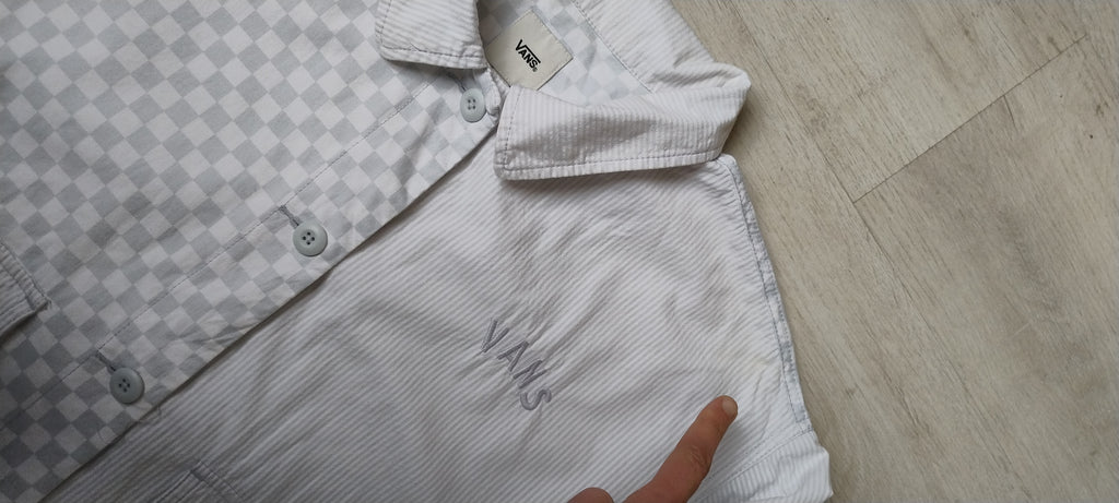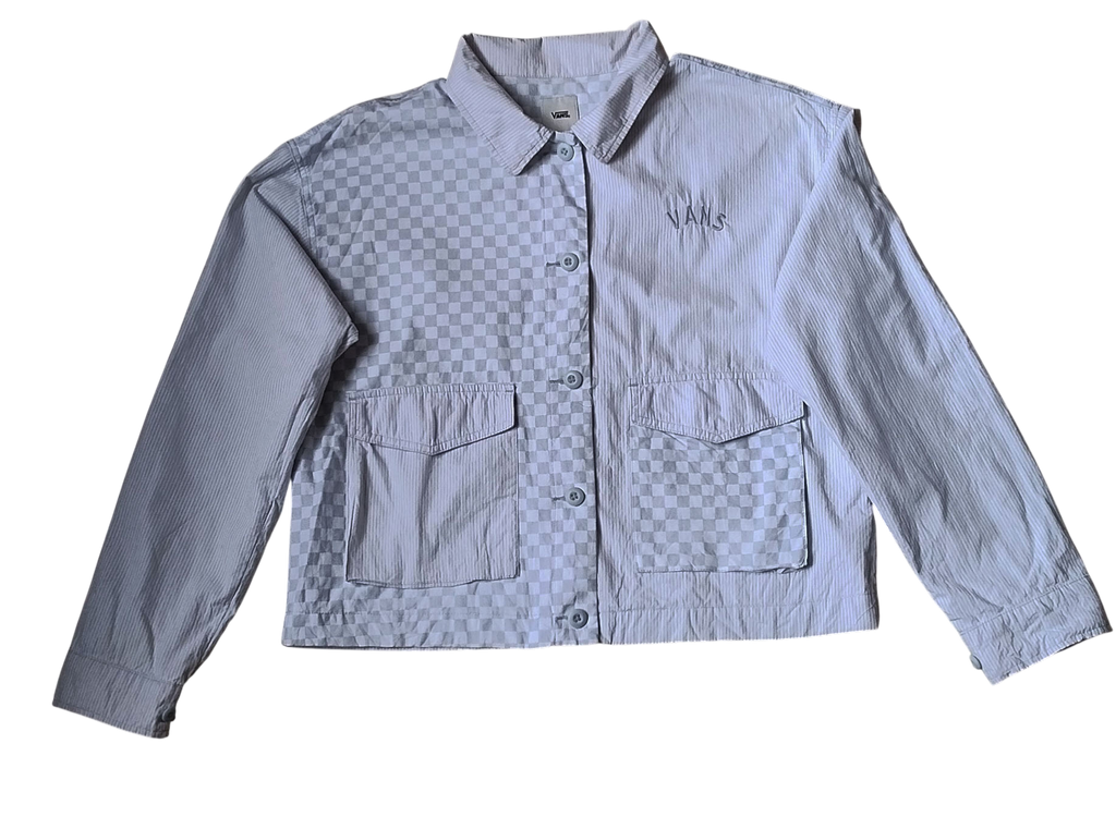 Jolie veste surchemise de mi-saison Van's à motif rayé et damier avec une fermeture par des boutons et des grandes poches à l'avant .
