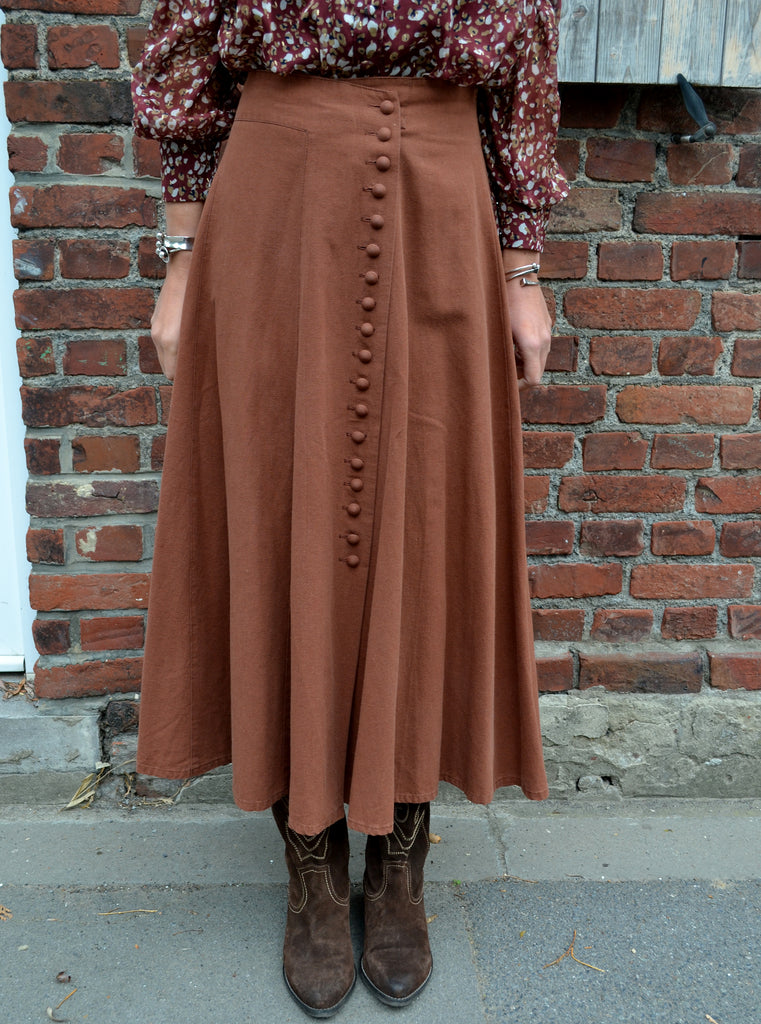 Jolie jupe longue coloris Terracotta vintage avec des petits boutons ton sur ton à l'avant.