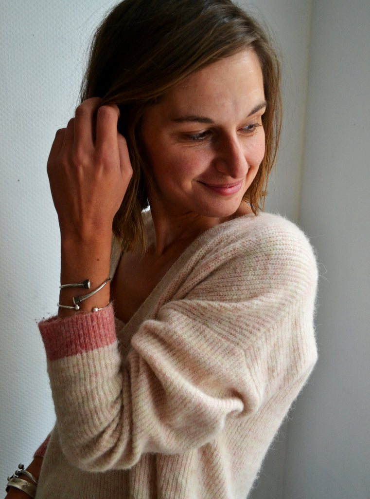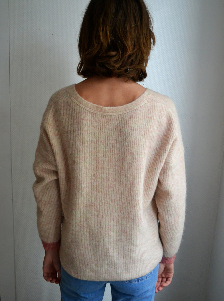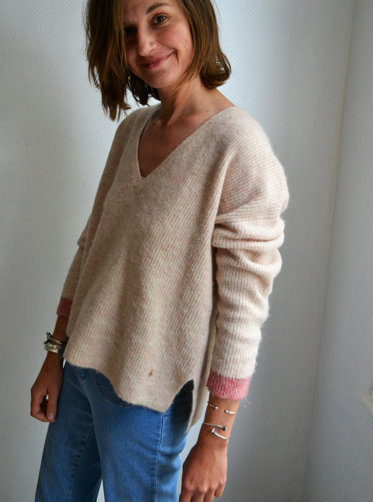 Joli pull rose pâle col V avec le bout des manches rose plus foncé Karl Marc John.