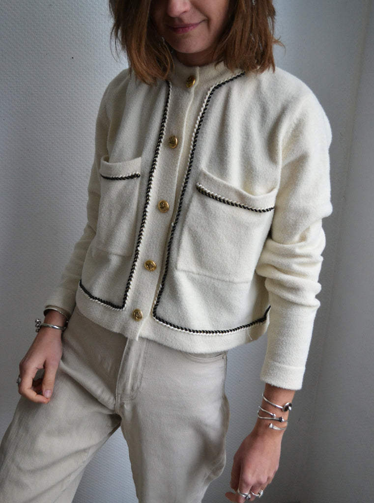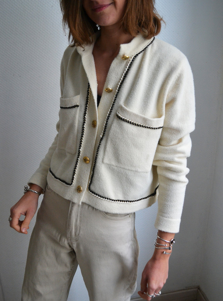 Joli gilet crop coloris écru et noir avec des poches sur la poitrine et des boutons dorés.