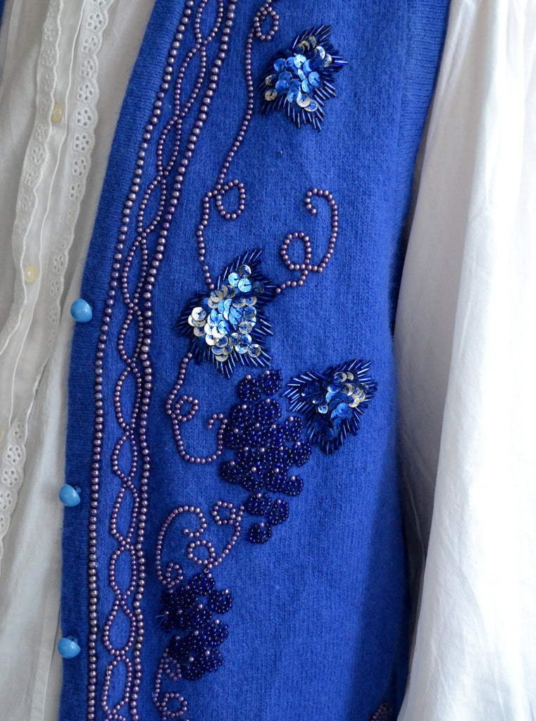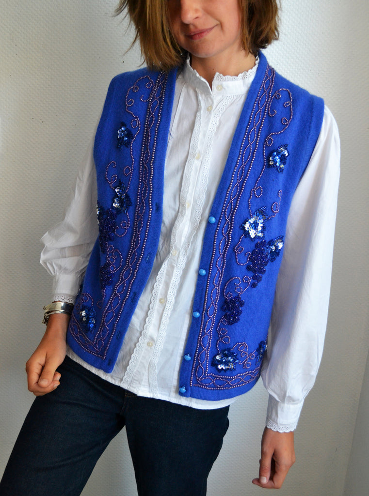 Joli gilet sans manche coloris bleu intense en laine et angora avec des perles et sequins brodées.