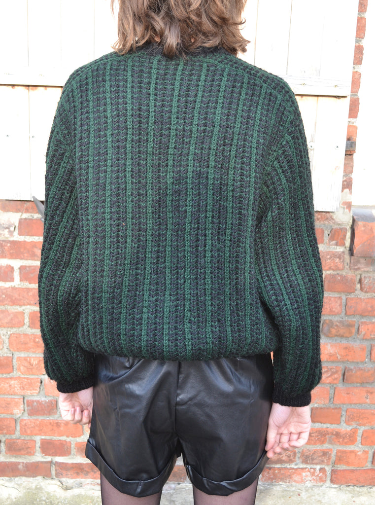 Joli pull fait main en mailles épaisse vintage chiné vert et bleu marine.