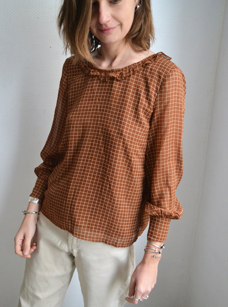 Jolie blouse doublée coloris marron à carreaux avec un décolleté que l'on peut mettre dans le dos ou devant.