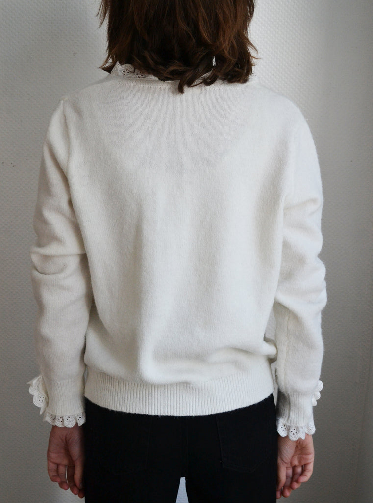 Joli gilet écru Kilky avec des broderies anglaises sur la patte de boutonnage et le bout des manches.