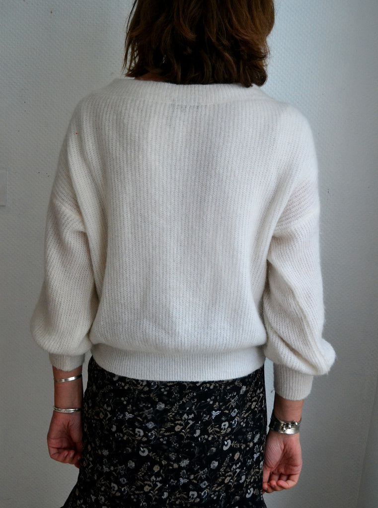 Joli pull tout doux italien blanc col V manches légèrement ballons.