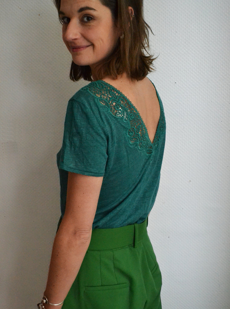 Joli t-shirt Sézane coloris vert sapin avec possibilité de mettre le décolleté dans le dos ou à l'avant.