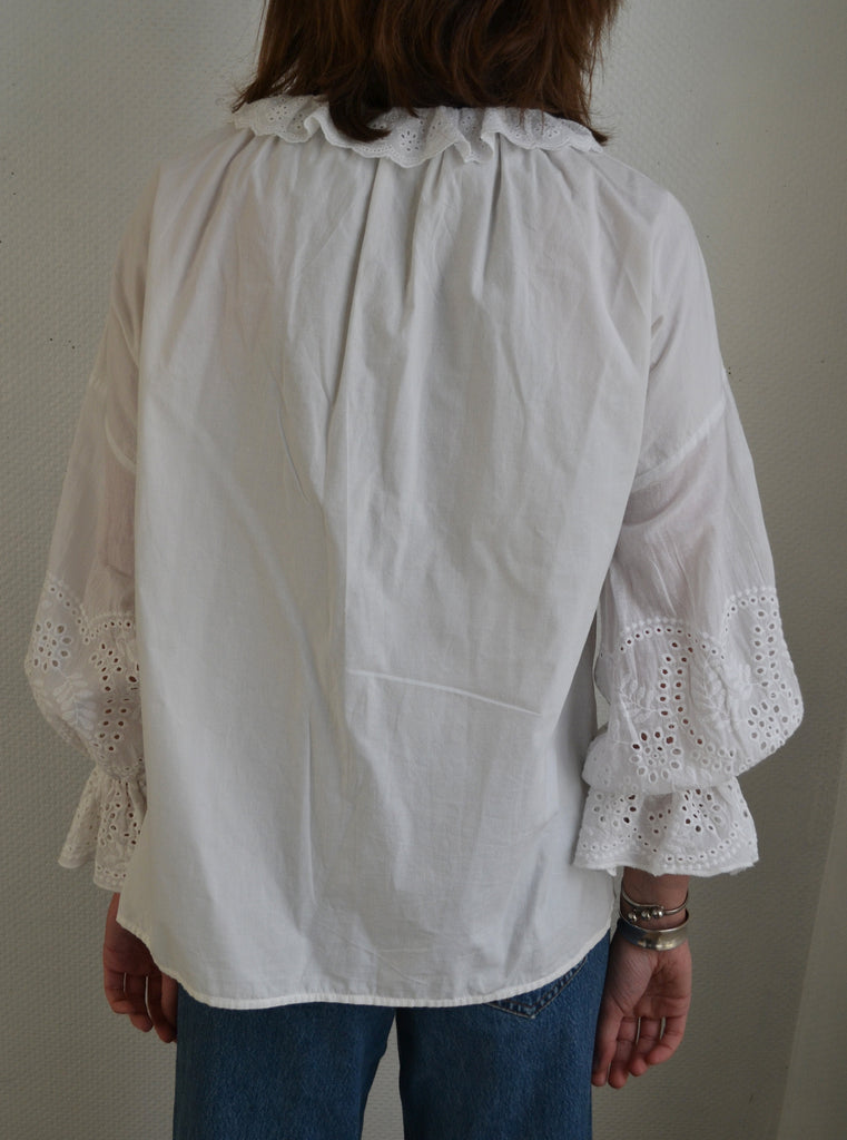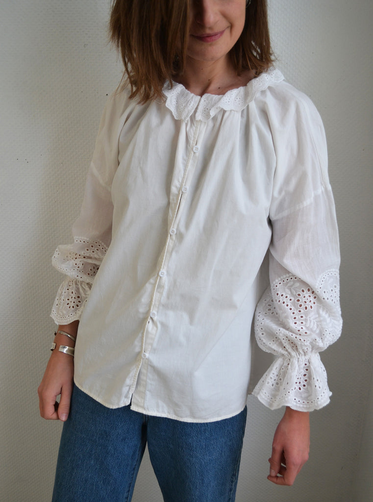 Jolie blouse blanche coupe loose boutonnée avec des broderies anglaises sur le bas des manches et des élastiques aux poignets.