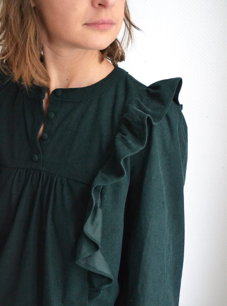 Jolie blouse coloris vert sapin en velours finement côtelé Cerise blue avec des boutons sur le haut du buste et des volants .