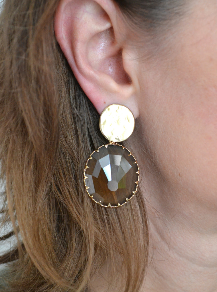 Une jolie paire de boucles d'oreilles constituées d'une base en métal doré martelé et d'une forme ovale en résine à facettes. Une paire de boucles originale à porter sur un look chic ou plus casual.