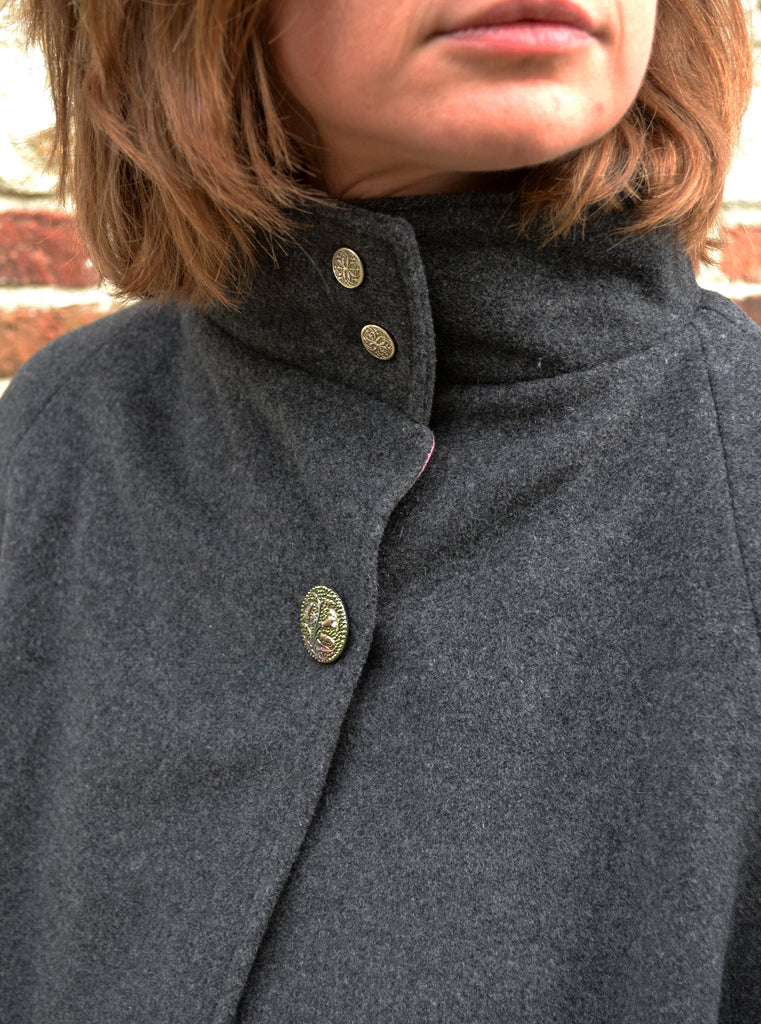 Très jolie cape en laine col montant coloris gris souris, fermeture par 3 boutons au niveau du cou avec une doublure en coton rose contrastant.