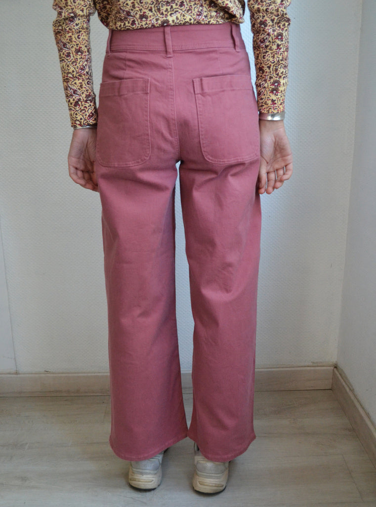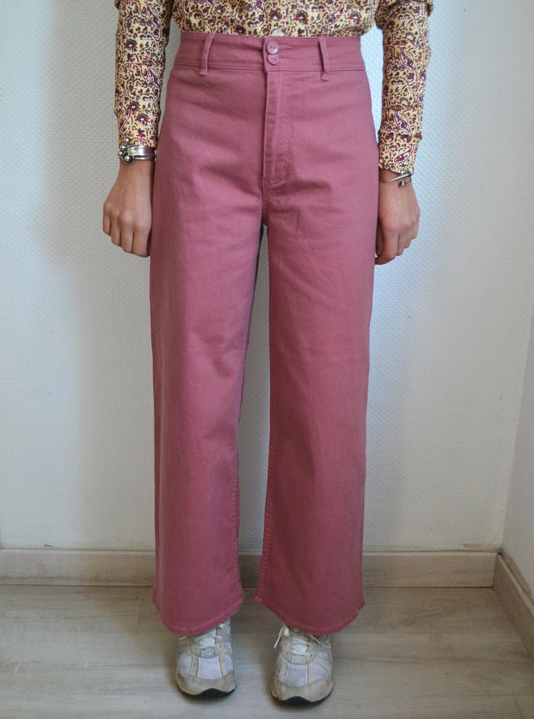 Joli jean taille haute coupe larges jambes avec une fermeture par deux boutons, un zip et des poches .