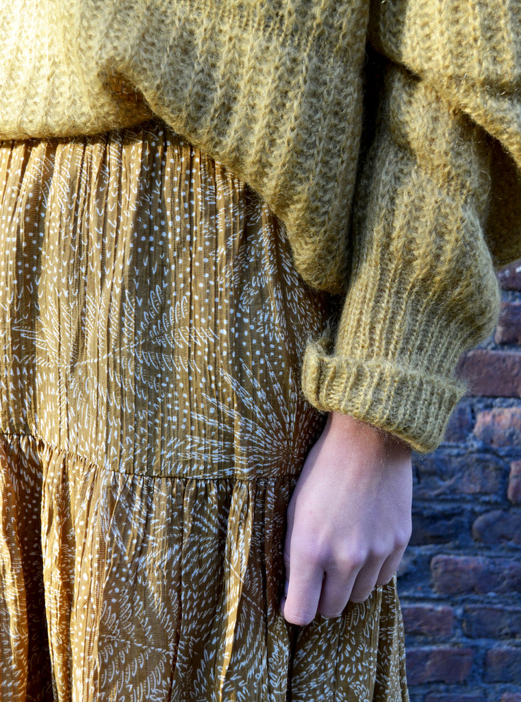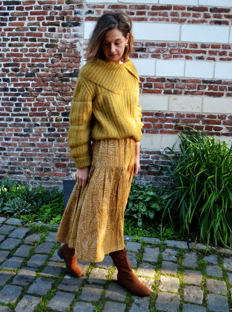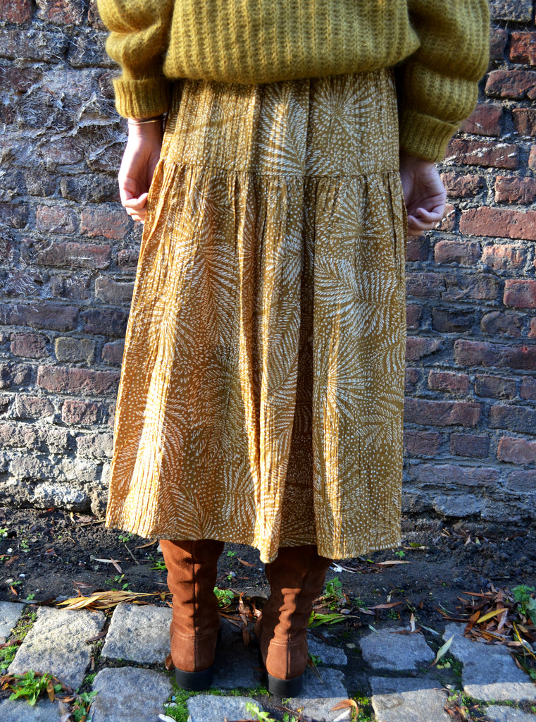Jolie jupe longue avec une taille élastique coloris moutarde/curry à motifs.