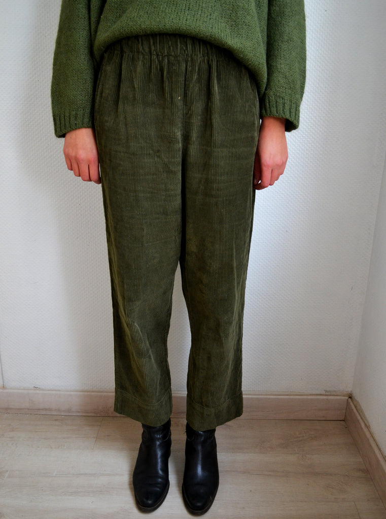 Joli pantalon en velours côtelé kaki Mika Elles coupe assez loose, taille élastique avec un lien à nouer, des poches .