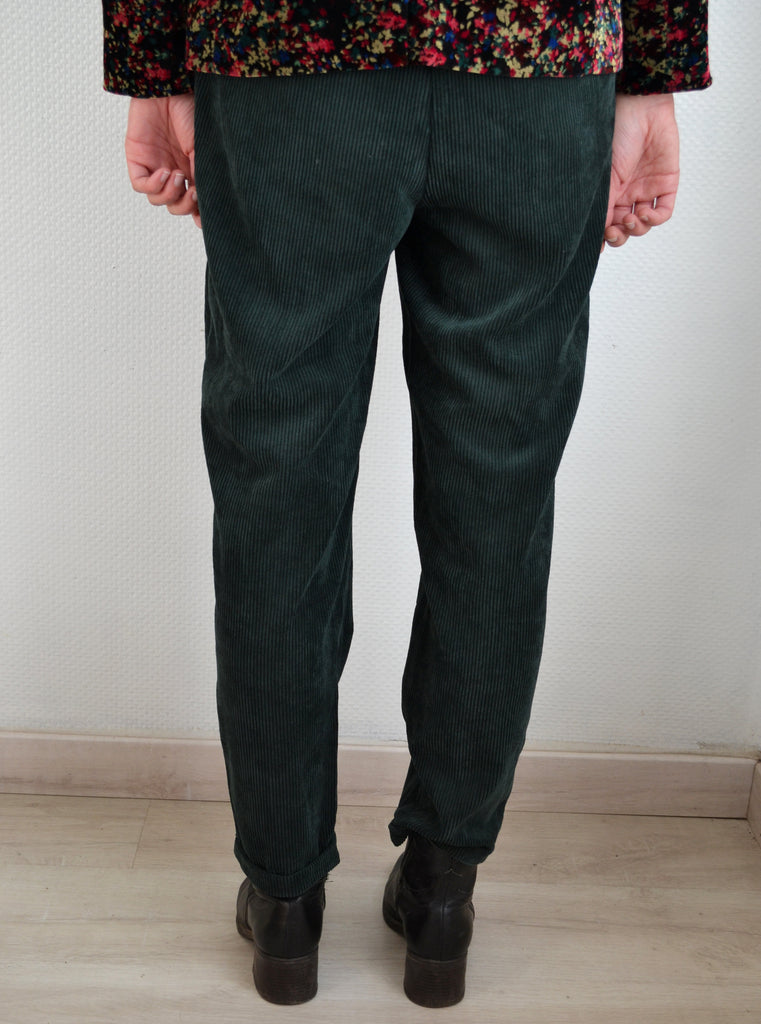 Joli pantalon fluide en velours côtelé coloris vert sapin avec un élastique à la taille, des passants et des poches.