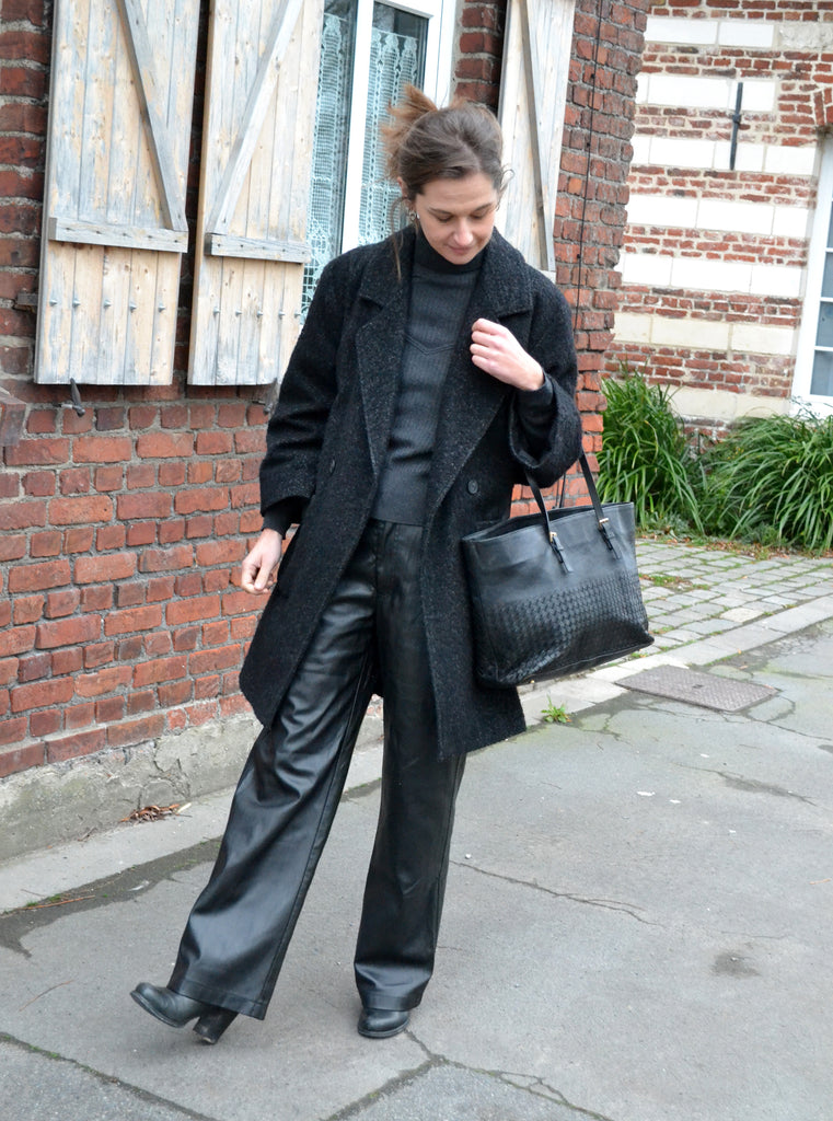 Joli pantalon Stradivarius coupe larges jambes en simili cuir noir avec une fermeture par un bouton et un zip, des poches.