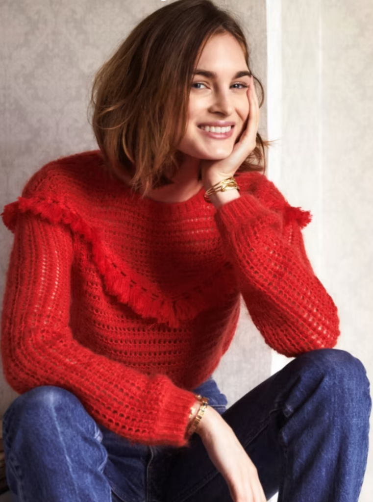 Joli pull rouge en mailles ajourées de chez Sézane avec des franges sur le haut du buste.