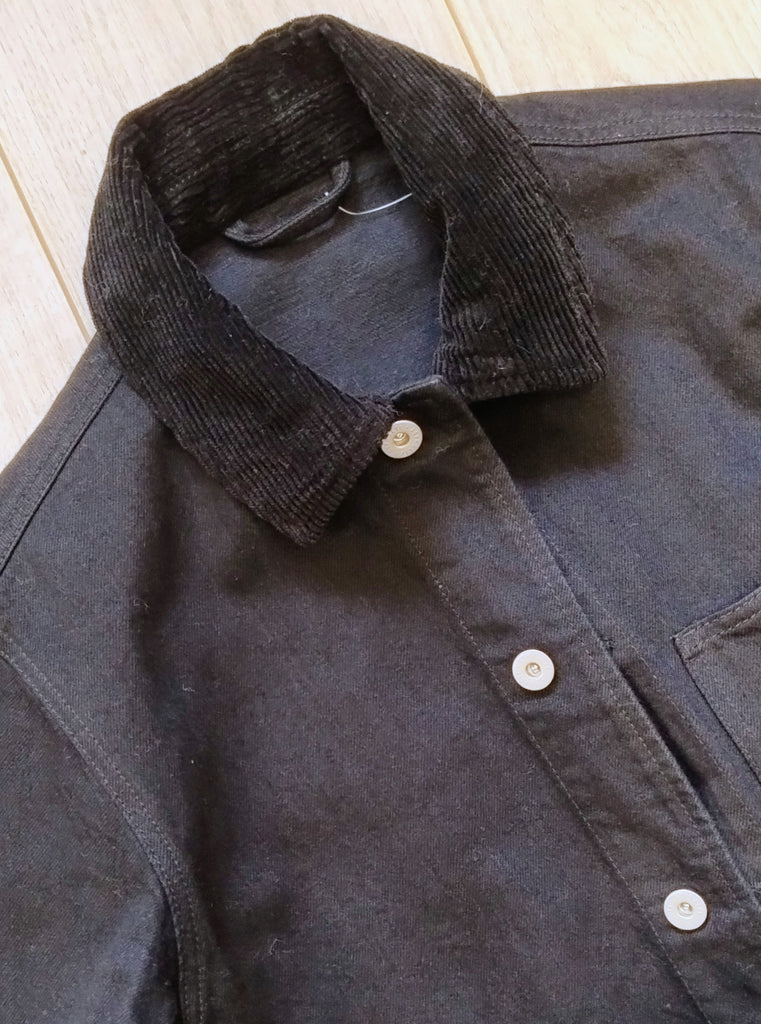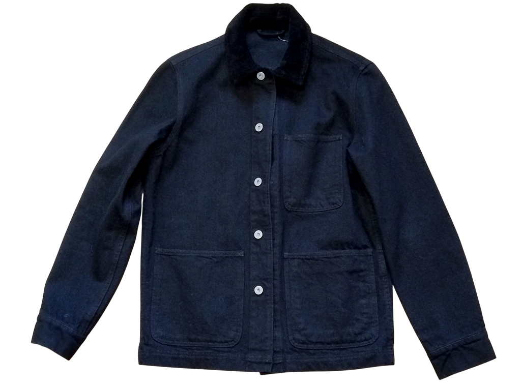 Jolie veste unisexe Asphalte noire style workwear avec un col côtelé, une fermeture par des boutons et trois poches à l'avant.