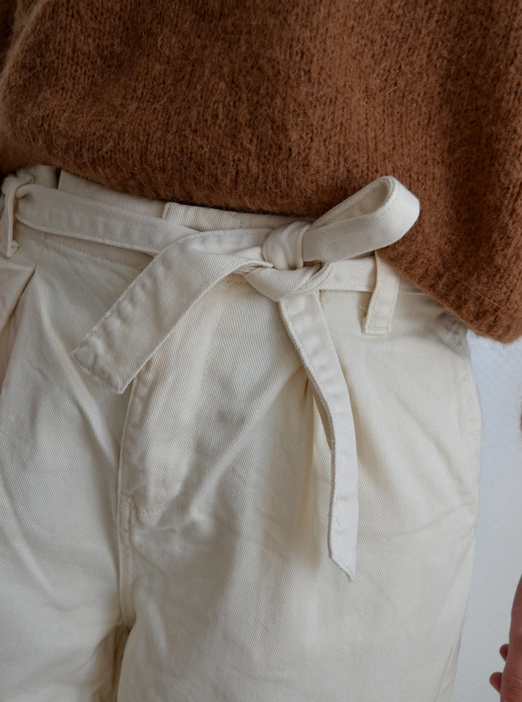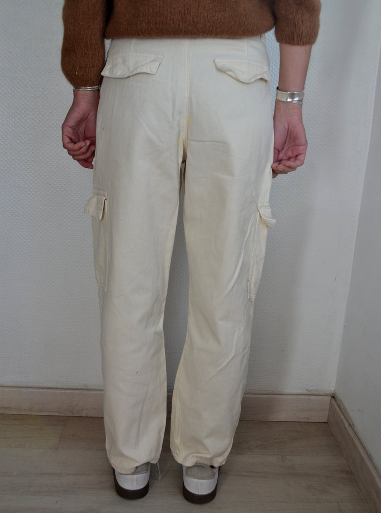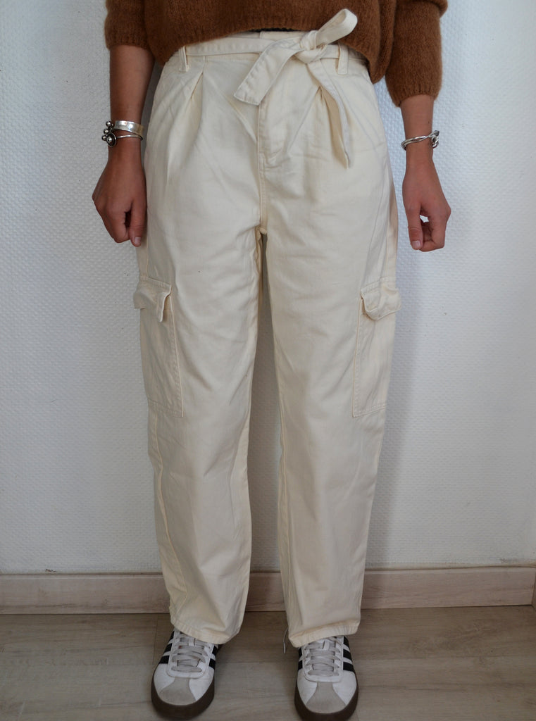 Joli pantalon coupe baggy Oraije coloris crème avec une fermeture par un zip, un bouton, des poches latérales et sur les jambes avec un lien à nouer à la taille.