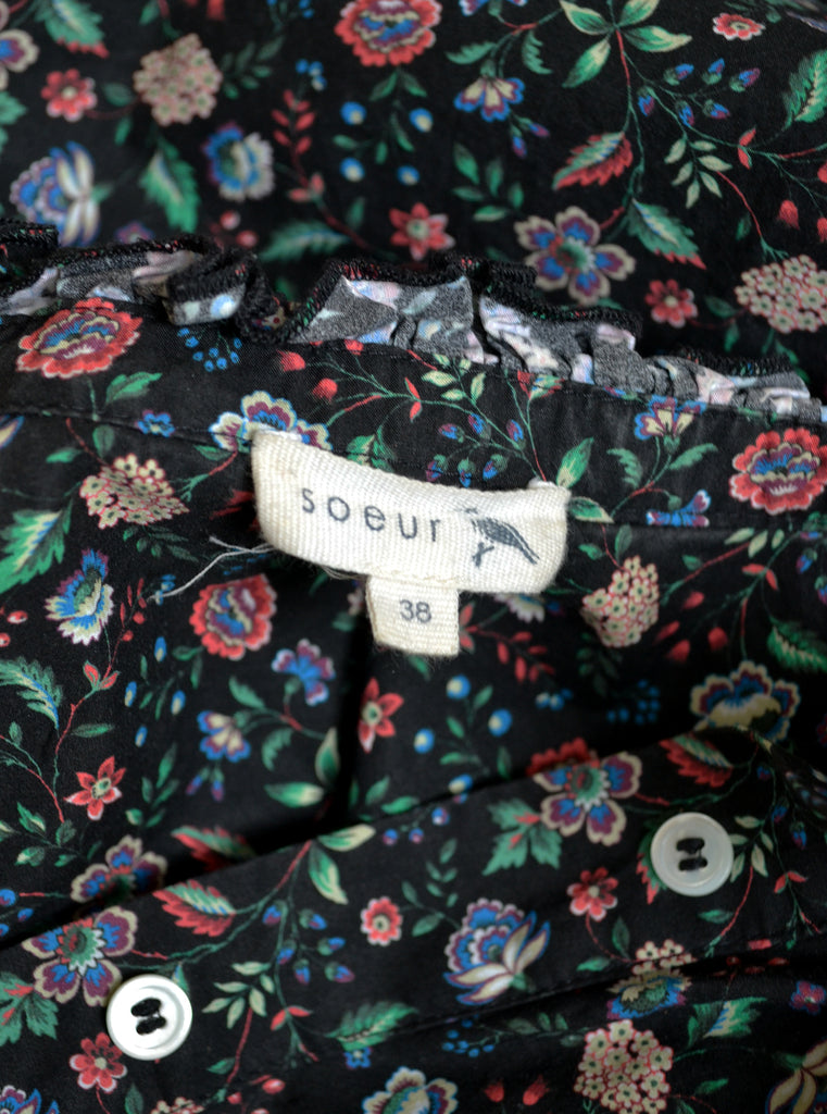 Jolie blouse en coton motif fleuris Sœur Paris avec des boutons sur le haut du buste et les poignets.
