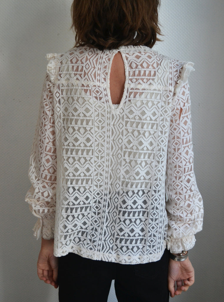 Jolie blouse écrue Suncoo boutonnée sur le haut du dos en dentelle écrue avec des petits volants sur le haut du buste.