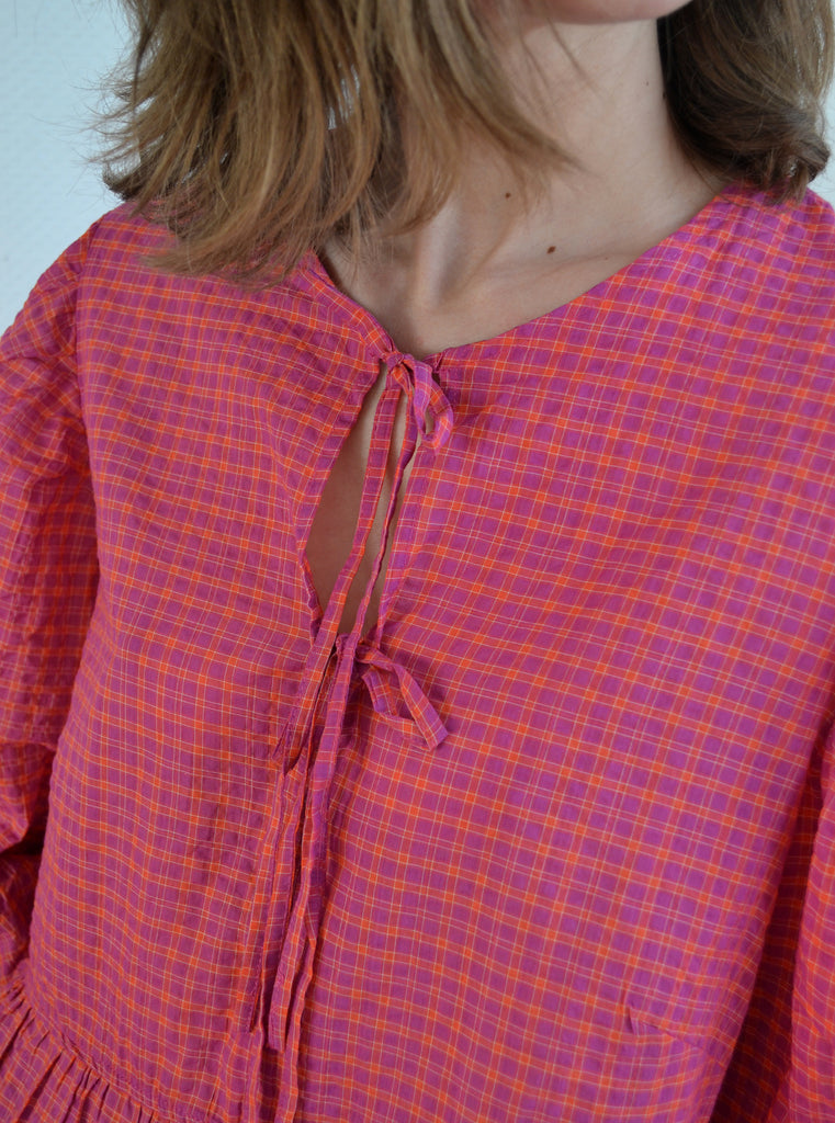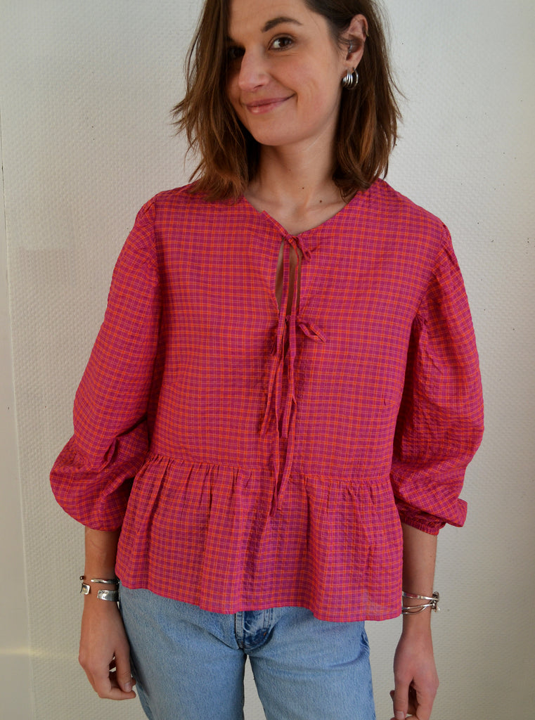 Jolie blouse à carreaux rose et orange Jane Wood manches ballons avec des nouettes sur le buste.