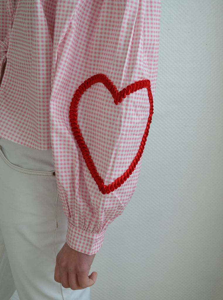 Jolie blouse vichy neuve avec étiquette à nouettes manches ballons avec des cœurs brodés sur les manches .