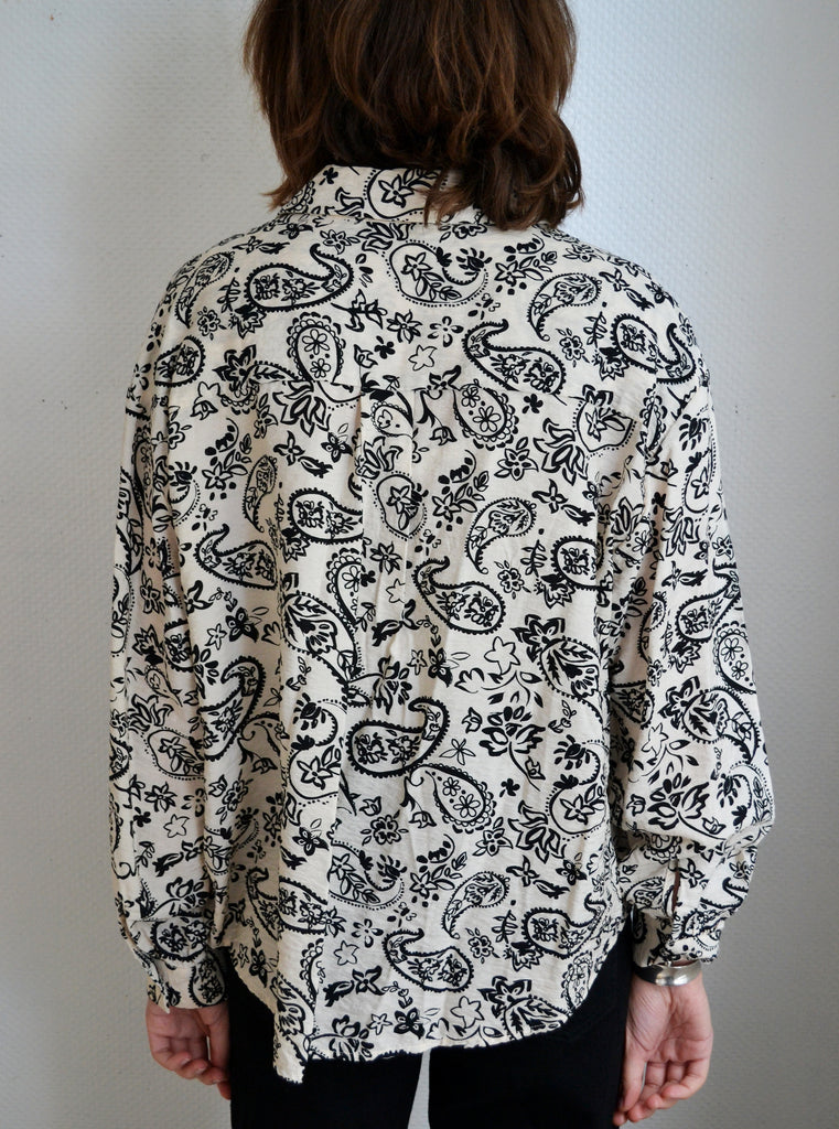 Jolie blouse fluide coloris écru à motifs paisley boutonnée.