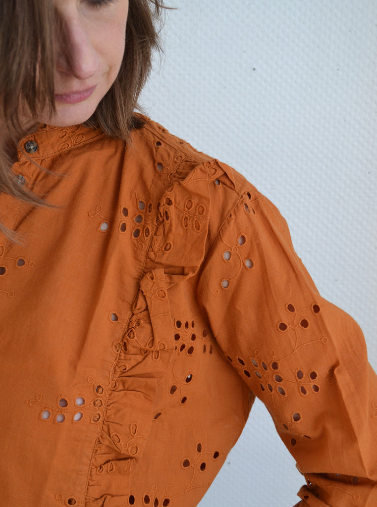 Jolie blouse en broderies anglaises ocre,