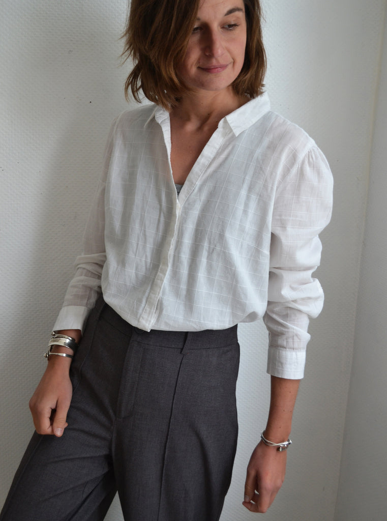 Jolie chemise blanche boutonnée avec un motif discret à carreaux ton sur ton.