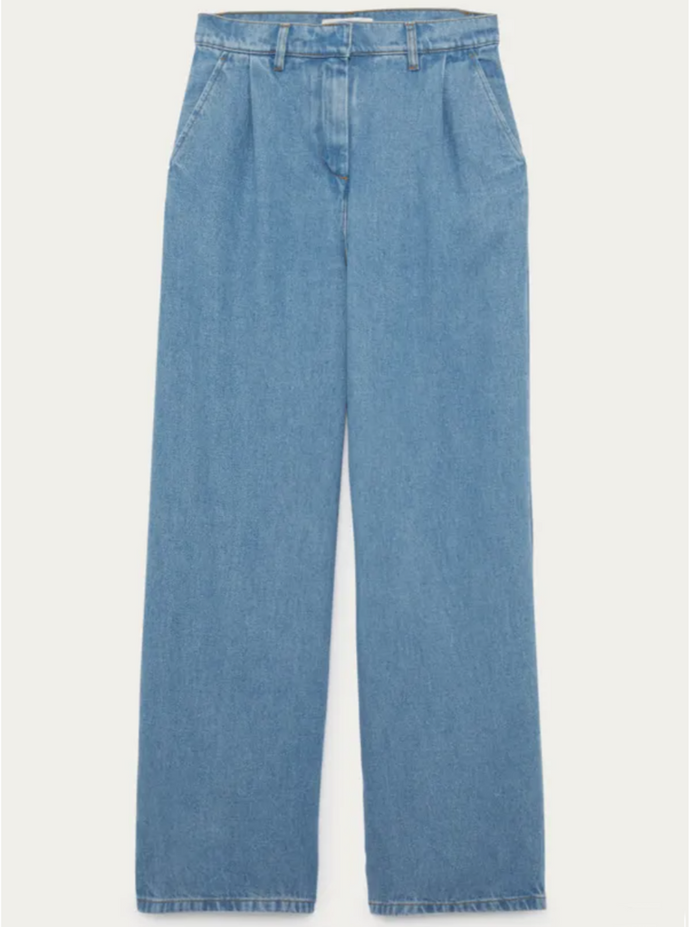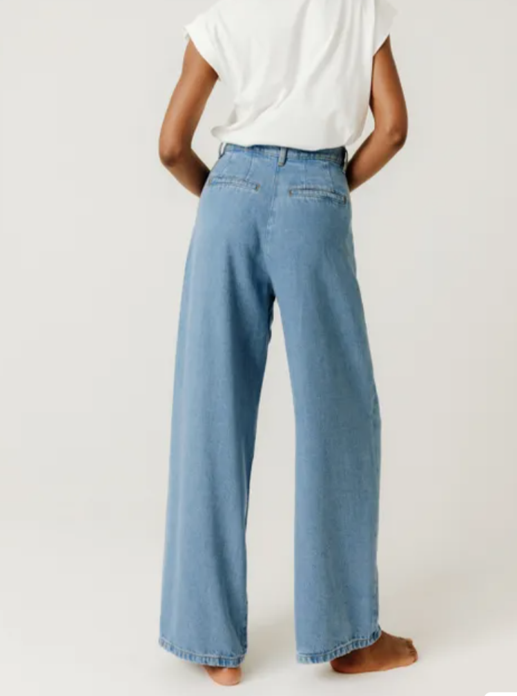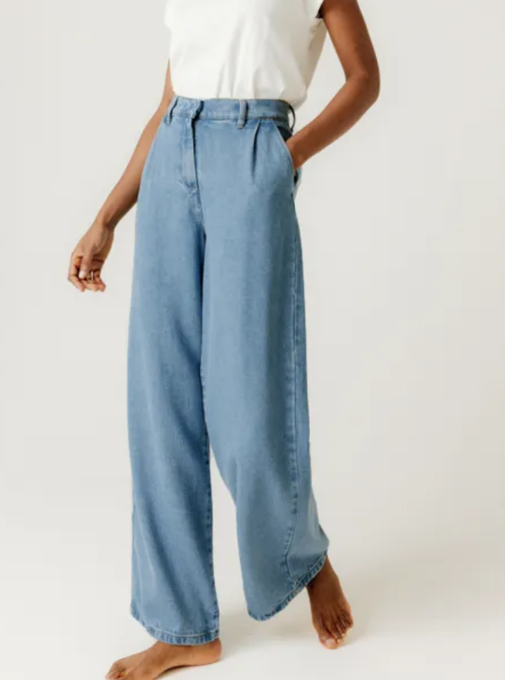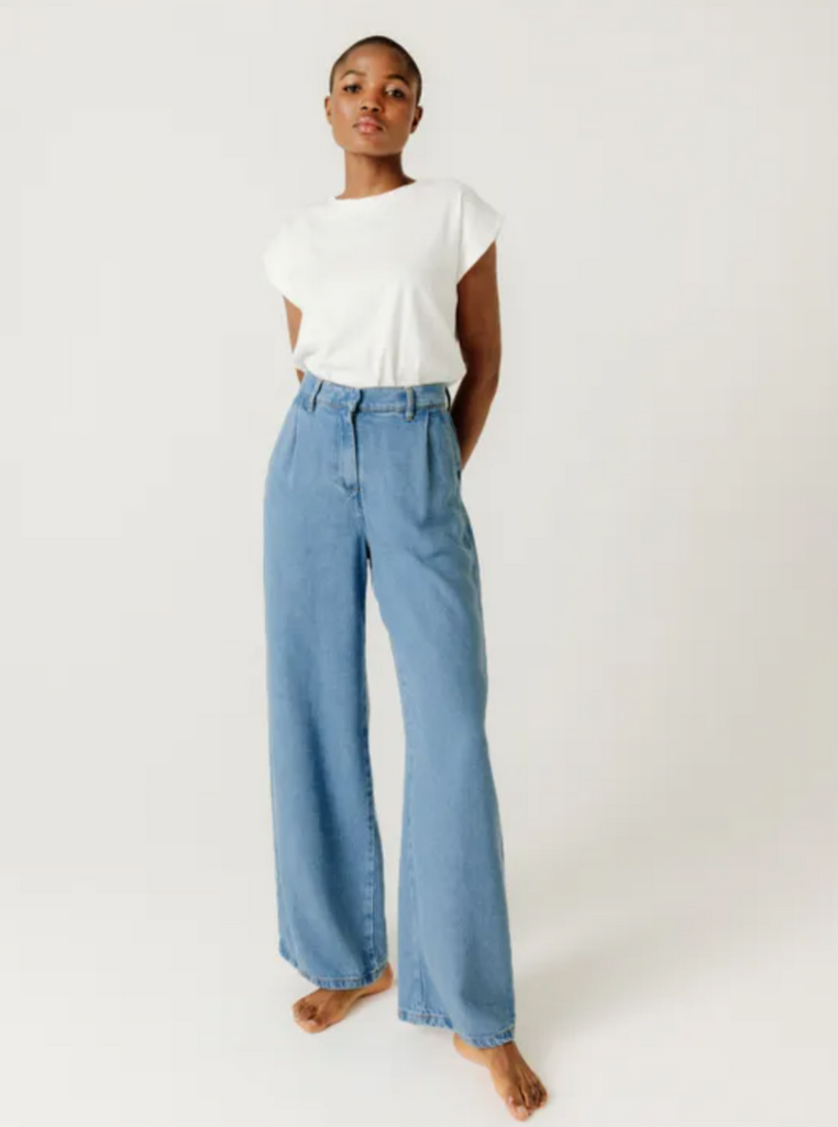 Superbe jean large jambes à pinces de chez Promod léger en Lyocell coloris bleu ciel, avec des poches latérales, une fermeture par un zip, une agrafe et un bouton
